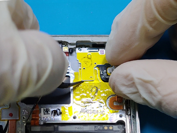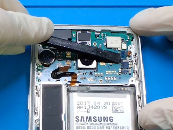 Sormenjälkitunnistimen kaapeli yhdistää puhelimen takalasiin lähellä pääkameraa. Kaapeli on hyvin lyhyt ja sen tulisi irrota, kun takalasi on poistettu.