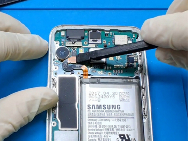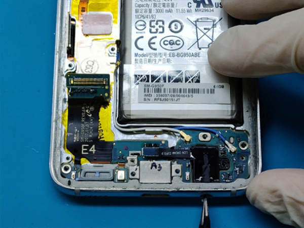 - Yksitoista 3,7 mm ruuvia tulee irrottaa. -Poista muovipala, joka on kiinnitetty emolevyyn ja peittää NFC:n antennin ja latauskelan kokoaminen.