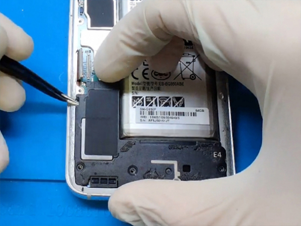 - Irrota alemman tytärlevyn muovikansi. - Irrota tytärlevyn kuusi 2,5 mm ruuvia. - Irrota liitin kuulokeliittimestä. - Irrota antennikaapelien liitännät. - Nosta emolevyä varovasti ja pidä samalla silmällä lähellä olevia liittimiä. - Irrota emolevy laitteesta leikkaamalla sen tytärlevyyn yhdistävä kaapeli. -Tässä vaiheessa otamme puhelimesta lisää komponentteja, kuten etukameran. Esim tärinämoottori - Ota ensin etukamera pois. - Irrota etukamera varovasti ontelosta muovisella tai pinseteillä. - Irrota etuosan anturiryhmä käyttämällä samaa menettelyä ja työkaluja. Tärinämoottori paljastuu sitten.
