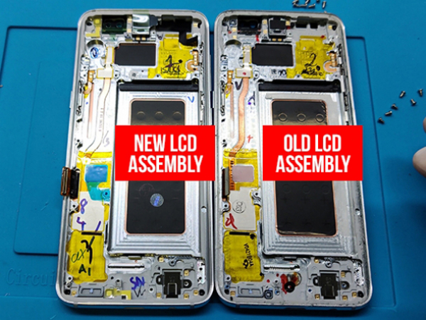 - Tässä vaiheessa kaikki aiemmin poistetut komponentit tulee siirtää uuteen näytökokoonpanoon. - Varmista, että uusi näyttö toimii oikein vertaamalla vanhaa ja uutta LCD-kokoonpanoa, joka sopii kaikkiin komponentteihin, jotka olemme aiemmin poistaneet. Poista kaikki uuden näytön suojakalvot paitsi se, joka suojaa etulasia. Huomautus: Käytämme kokoonpanoa, joka sisältää LCD-näytön ja keskikehyksen.