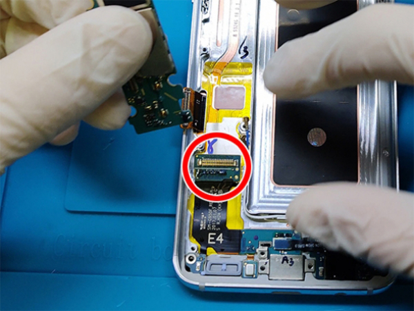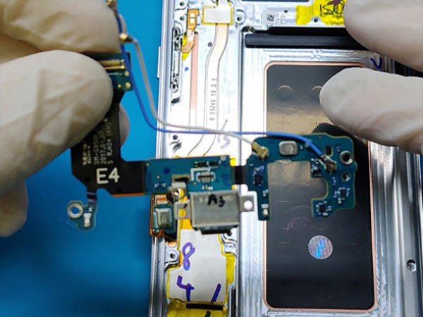 - Irrota kuulokeliitäntä, joka oli aiemmin irrotettu. - Irrota herkät antennikaapelit kiinnikkeistä erittäin varovasti. Nyt voit ottaa tytärlevyn pois. - Tytärkortin latausportti ja mikrofoni on juotettu siihen kiinni.
