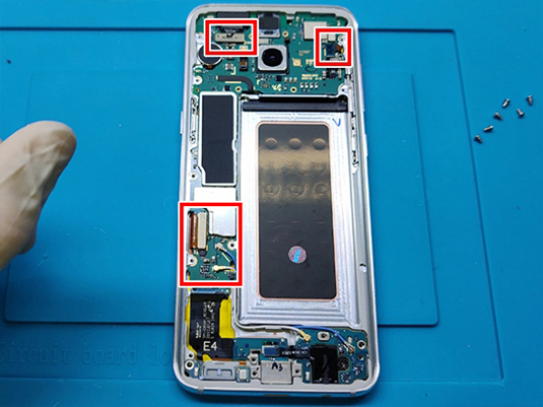- Liitä emolevy ja anturiryhmän liitin (oikea yläkulma). -Kytke emolevyn etukameran liitin (vasen yläkulma). -Yhdistä emolevy ja digitoija (alhaalla vasemmalla). Antennit tulee sitten liittää emolevyyn.