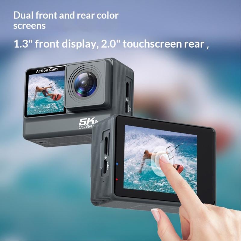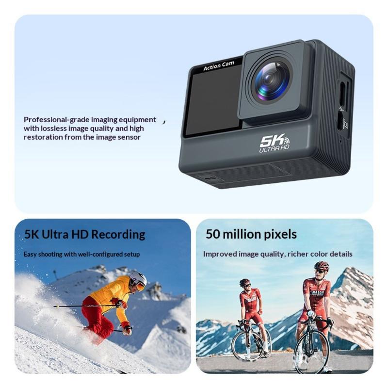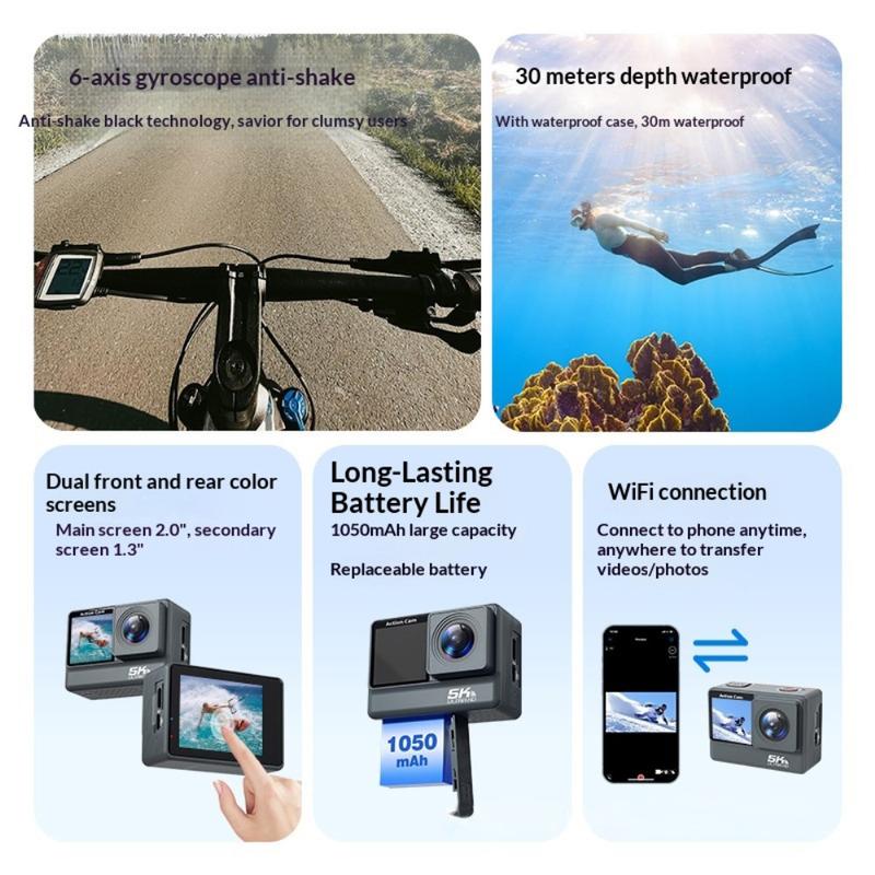 F308AATR kaksoisnäytöllinen action-kamera - 5K HD -urheilukamera, jossa on 6-akselinen vakaus, WiFi ja vedenpitävä kotelo