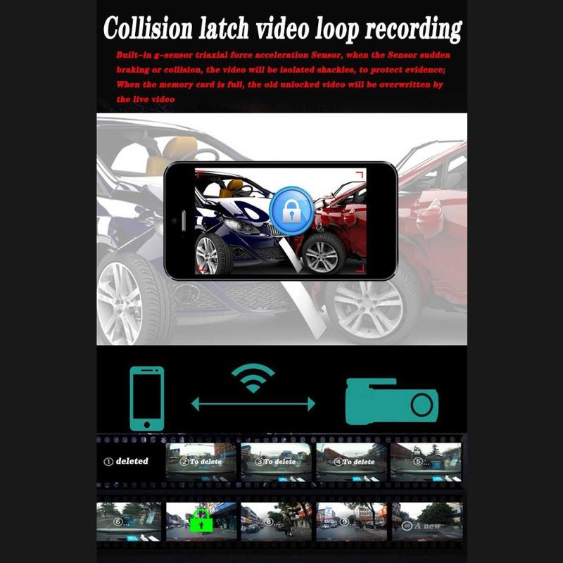 Yhdistä kojelautakamera älypuhelimeesi (Android / iOS) sisäänrakennetun WiFi-moduulin kautta. Käytä mobiilisovellusta reaaliaikaiseen esikatseluun, toistoon, asetusten säätämiseen ja videon lataamiseen - kaikki laitteestasi.