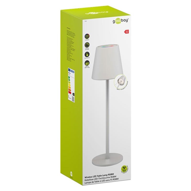 Goobay langaton LED-pöytävalaisin RGBW - kosketusohjaus, lämmin valkoinen 3000 K + RGB-värit, portaattomasti himmennettävä, USB-C-ladattava, IP44