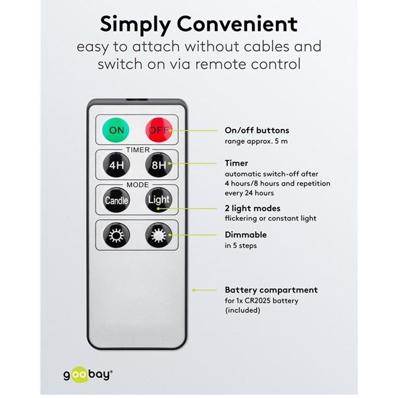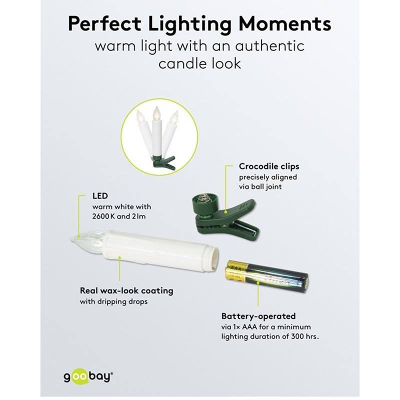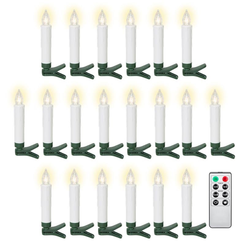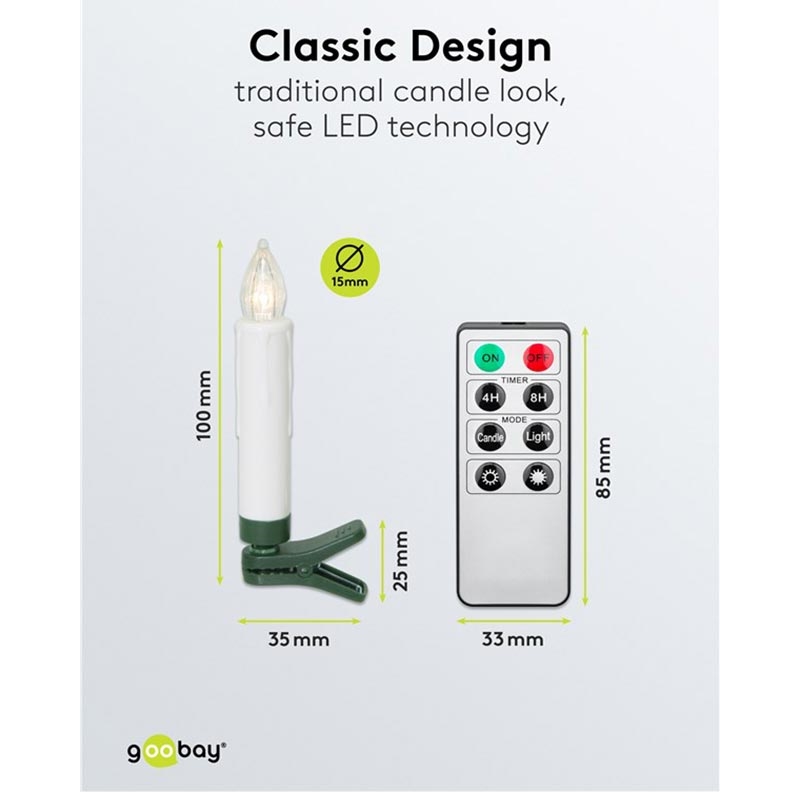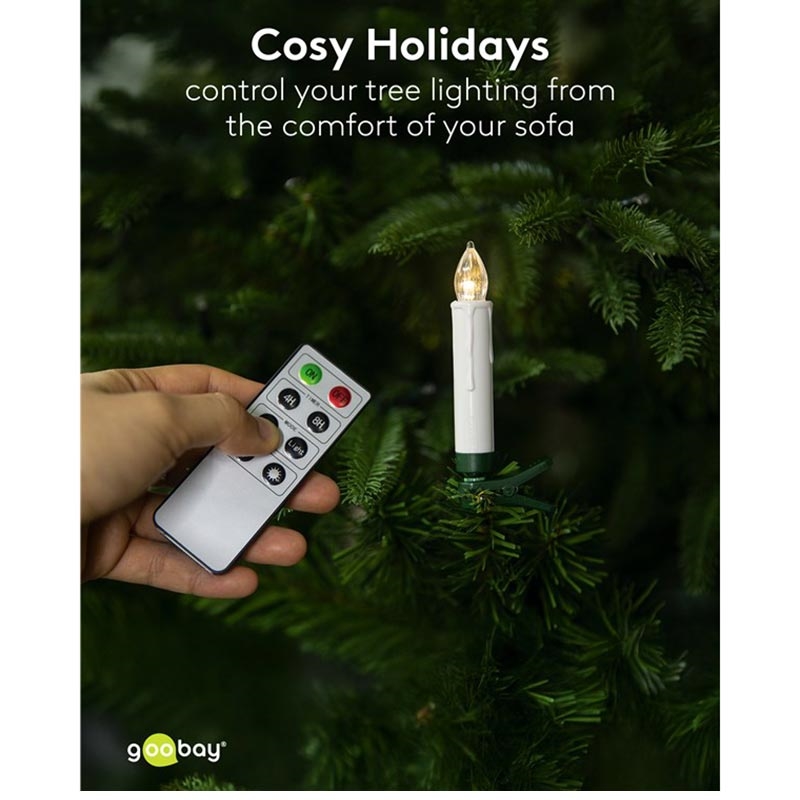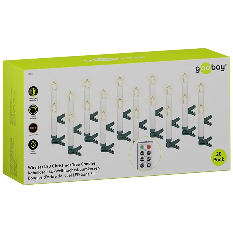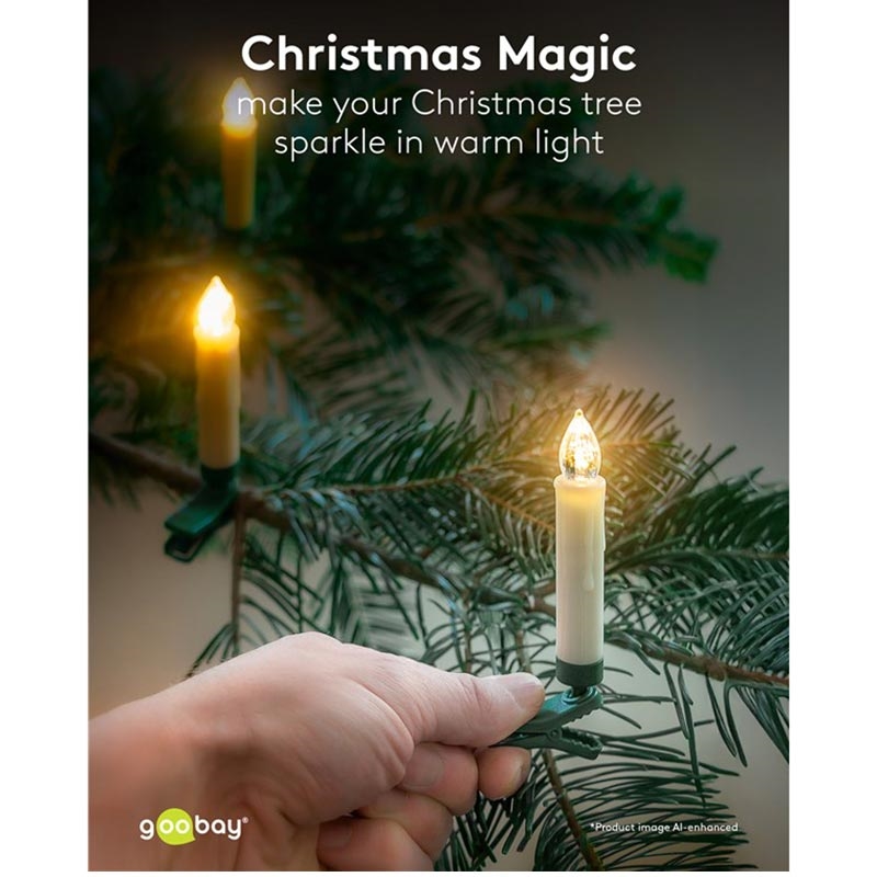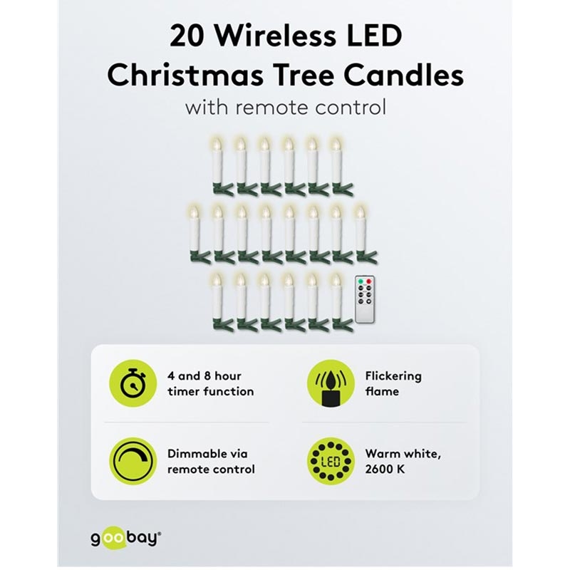 Goobay langaton LED-joulukuusen kynttiläsarja - 20 himmennettävää kynttilää klipseillä, kaukosäätimellä ja ajastimella (2600 K)