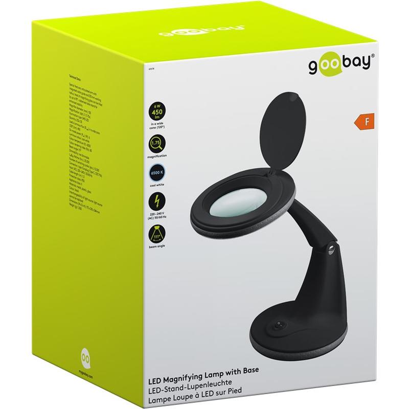 Goobay LED suurennusvalaisin jalustalla - 6W rengasvalo, 100 mm lasilinssi, 1.75x (3 dioptriaa), 450 lm, 6500K Cool White, säädettävä varsi (musta)