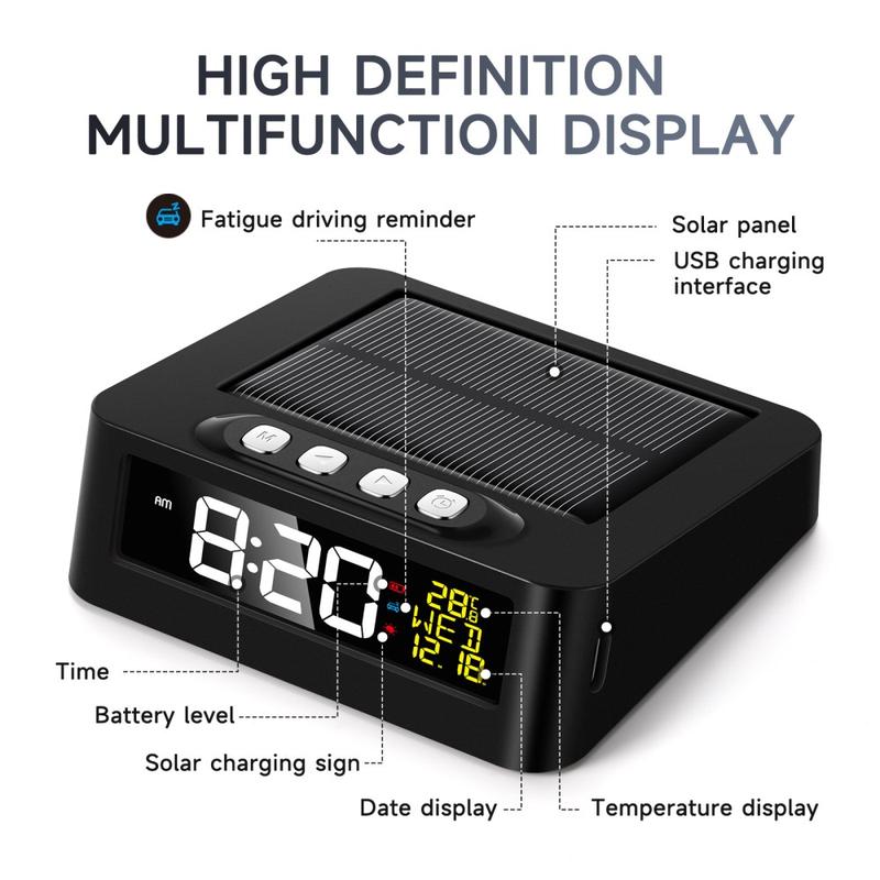 Saat kannettavan kellon, joka toimii aurinkovoimalla tai USB Type-C -latauksella, joten se on luotettava kotona ja matkoilla. Väsymyshälytys lisää käytännöllistä turvallisuutta kuljettajille.