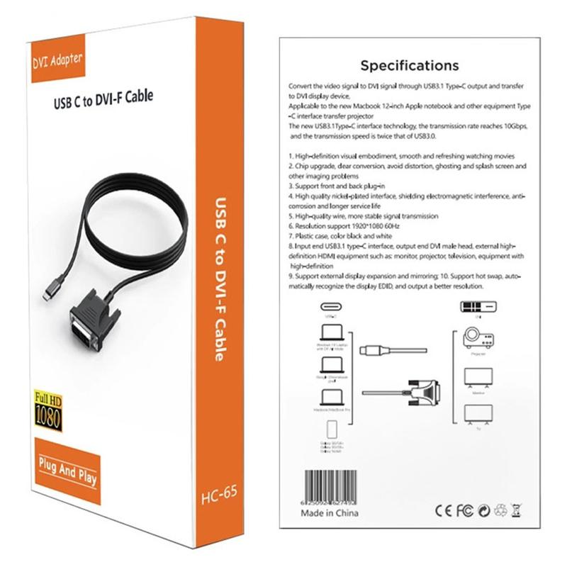 Liitä USB-C-laitteesi DVI-näyttöön tai -projektoriin HC-65 USB-C-DVI-sovitinkaapelilla. Tämä kaapeli on suunniteltu kannettaville tietokoneille, tableteille ja yhteensopiville älypuhelimille, ja sen avulla voit peilata tai laajentaa näytön suuremmille näytöille esityksiä, toimistotyötä ja multimedian katselua varten. Se tukee 1080p Full HD -tarkkuutta ja tarjoaa selkeän ja vakaan kuvan, joka sopii päivittäiseen tuottavuuteen ja viihteeseen.