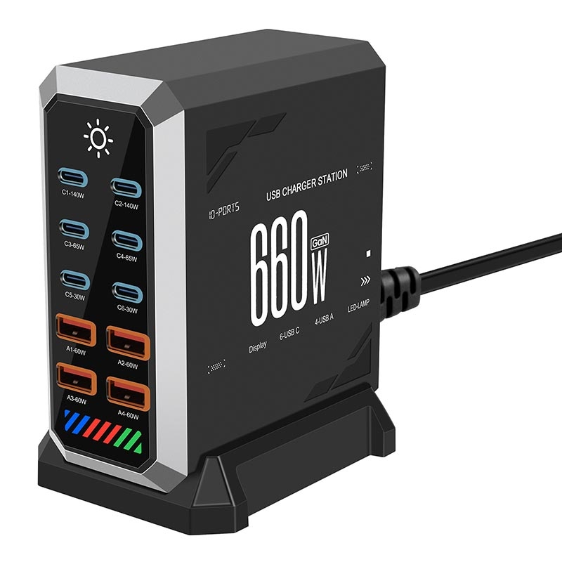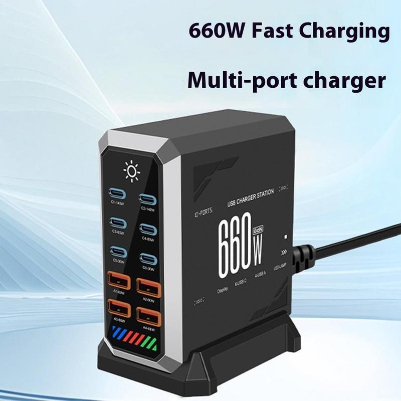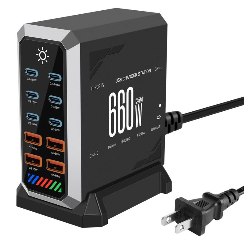 - Massiivinen 660 W:n lähtöteho - Tuottaa yhteensä jopa 660 wattia, mikä helpottaa virtaa vaativien kannettavien tietokoneiden, älypuhelinten, tablettien ja muiden laitteiden lataamista erittäin nopeilla latausnopeuksilla.