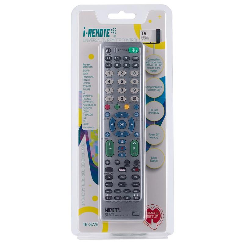 i-Remote TR577E tarjoaa universaalin yhteensopivuuden, helpon käytön, luotettavan kantaman ja kestävän rakennuslaadun, mikä tekee siitä erinomaisen, budjettiystävällisen korvaavan kaukosäätimen mihin tahansa televisioon.