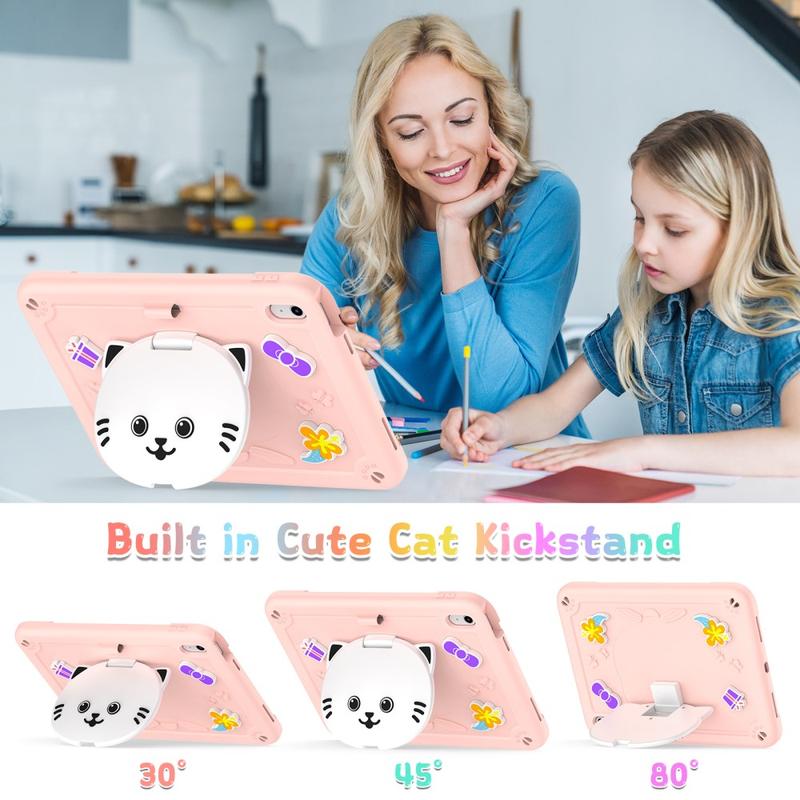 Söpö kissa hybridi kotelo potkukannattimella, olkahihnalla ja kynänpidikkeellä iPad (2022), iPad (2025)