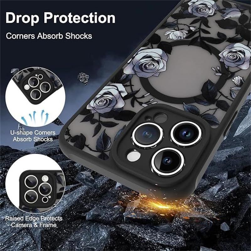 Rose Flower MagSafe Case iPhone 14 Proille tarjoaa täydellisen yhdistelmän vintage-viehätystä ja modernia innovaatiota. Kestävän hybridirakenteensa, sormenjälkiä estävän viimeistelynsä ja täyden MagSafe-yhteensopivuutensa ansiosta se suojaa puhelintasi pitäen sen samalla tyylikkäänä, ohuena ja toimivana.