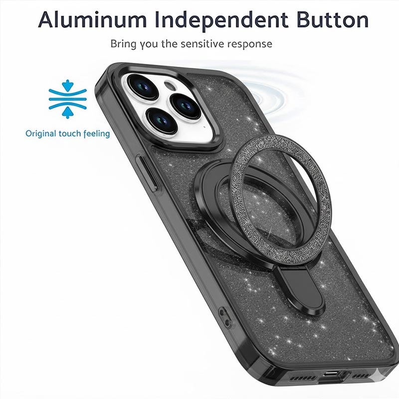 Glitter Kotelo potkukiinnikkeellä iPhone 15 Proille - MagSafe-yhteensopiva TPU + PC hybridi potkukiinnike kansi