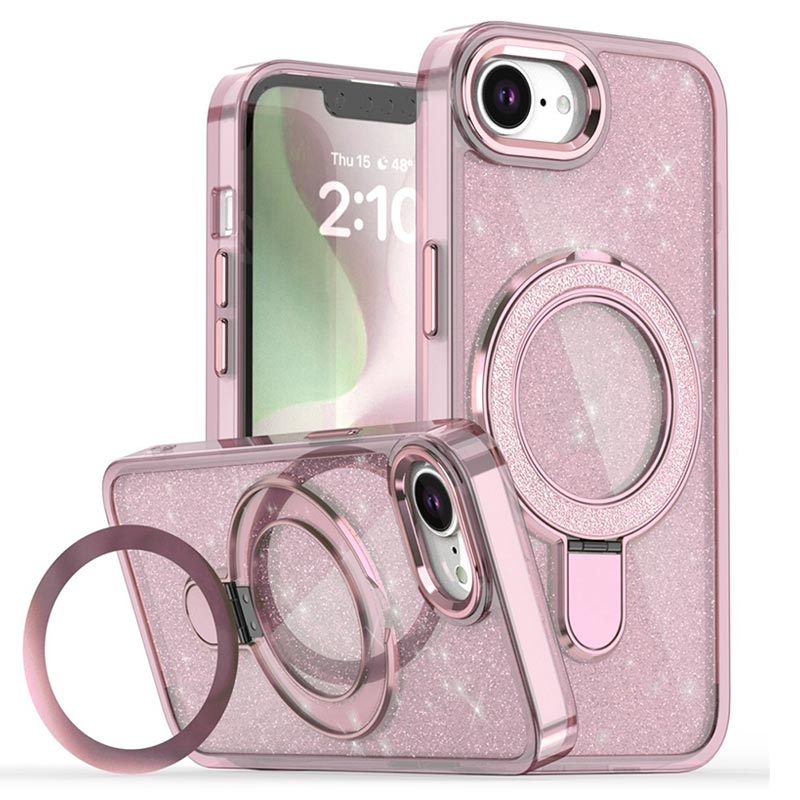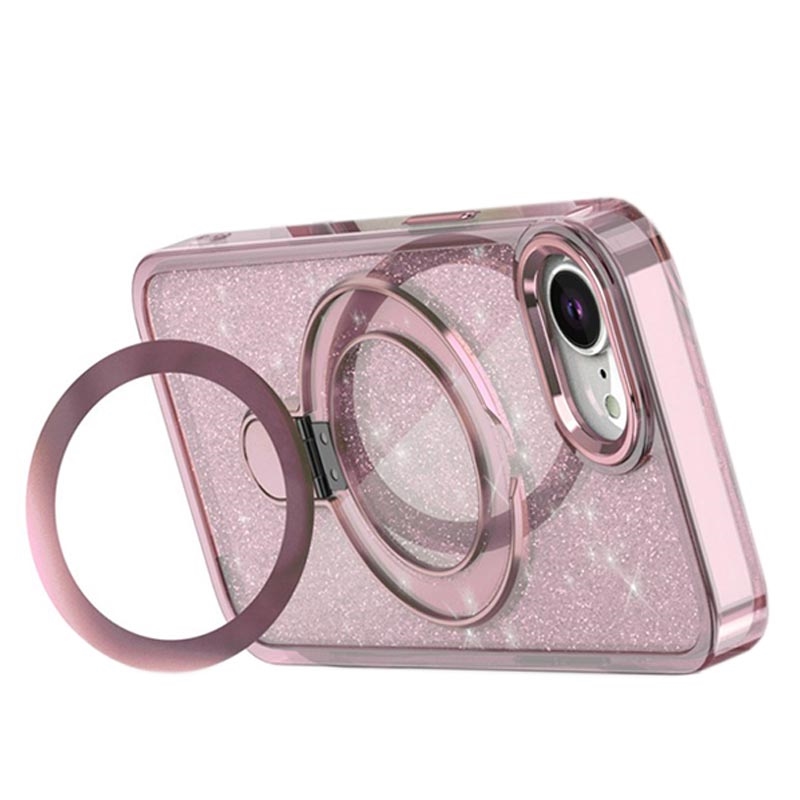Glitter Kotelo potkukiinnikkeellä iPhone 16eille - MagSafe-yhteensopiva TPU + PC hybridi potkukiinnike kansi