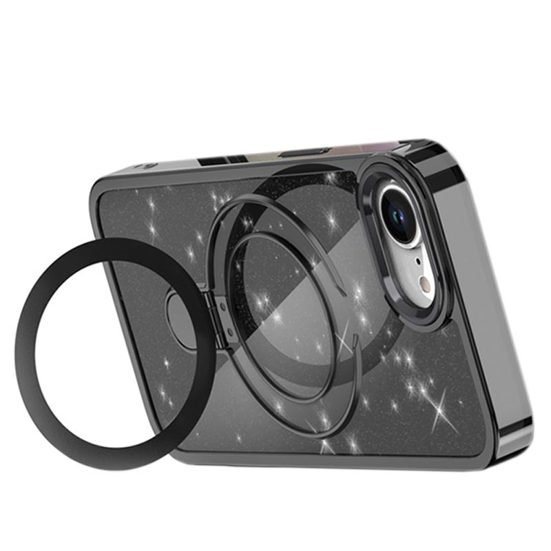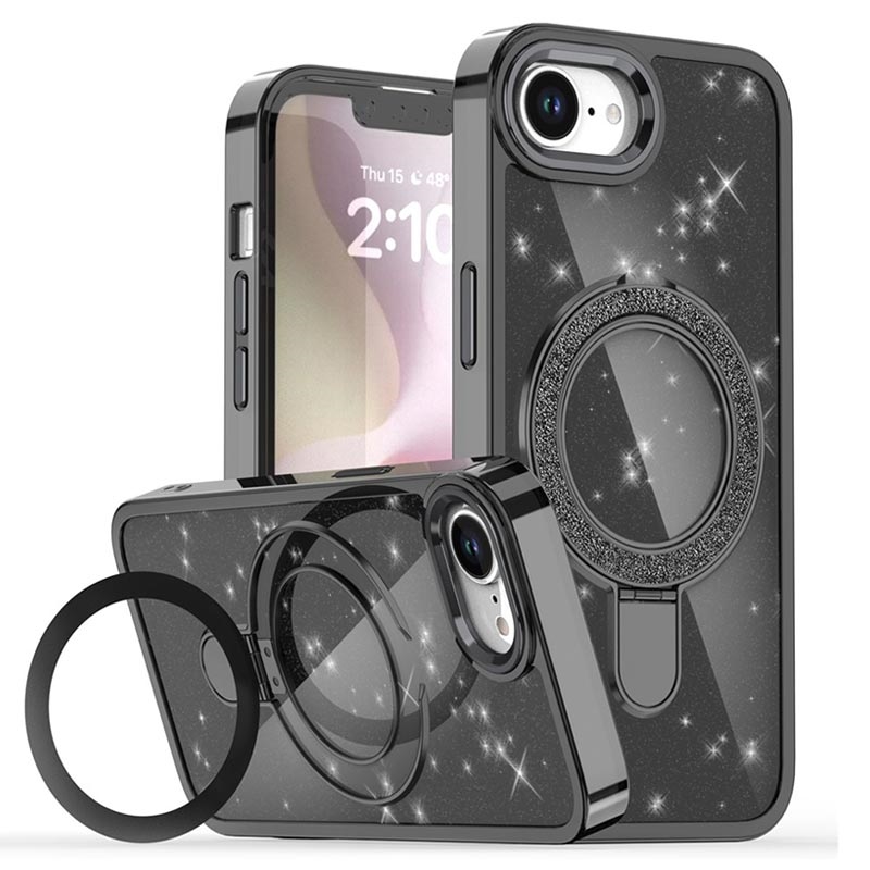 Glitter Kotelo potkukiinnikkeellä iPhone 16eille - MagSafe-yhteensopiva TPU + PC hybridi potkukiinnike kansi