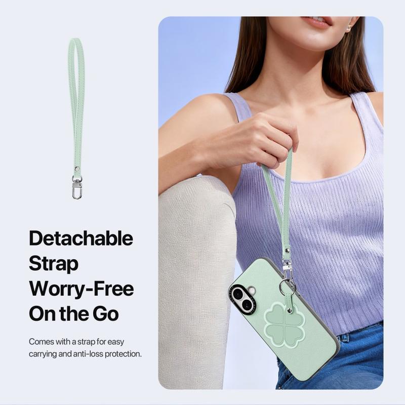 Mukana on irrotettava hihna, joka helpottaa kantamista matkoilla, työmatkoilla tai päivittäisissä toiminnoissa. Se tarjoaa lisäturvaa katoamisen varalta ja antaa samalla iPhone 17 -puhelimellesi muodikkaan lisävarusteen kosketuksen.