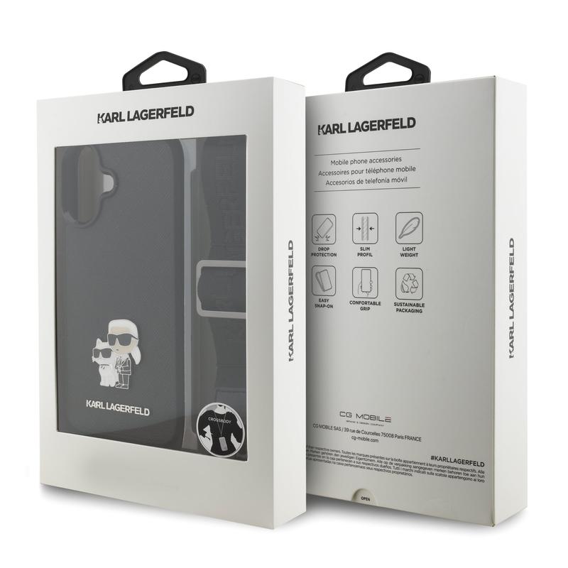 iPhone 17 Karl Lagerfeld Saffiano Crossbody Metal Karl & Choupette Cover - Musta tarjoaa tuotteen, joka on yhtä toimiva kuin tyylikäs. Suojaa iPhone 17 -puhelintasi tällä elegantilla suojakuorella ja nauti sekä turvallisuuden että muodin eduista.