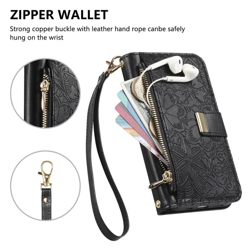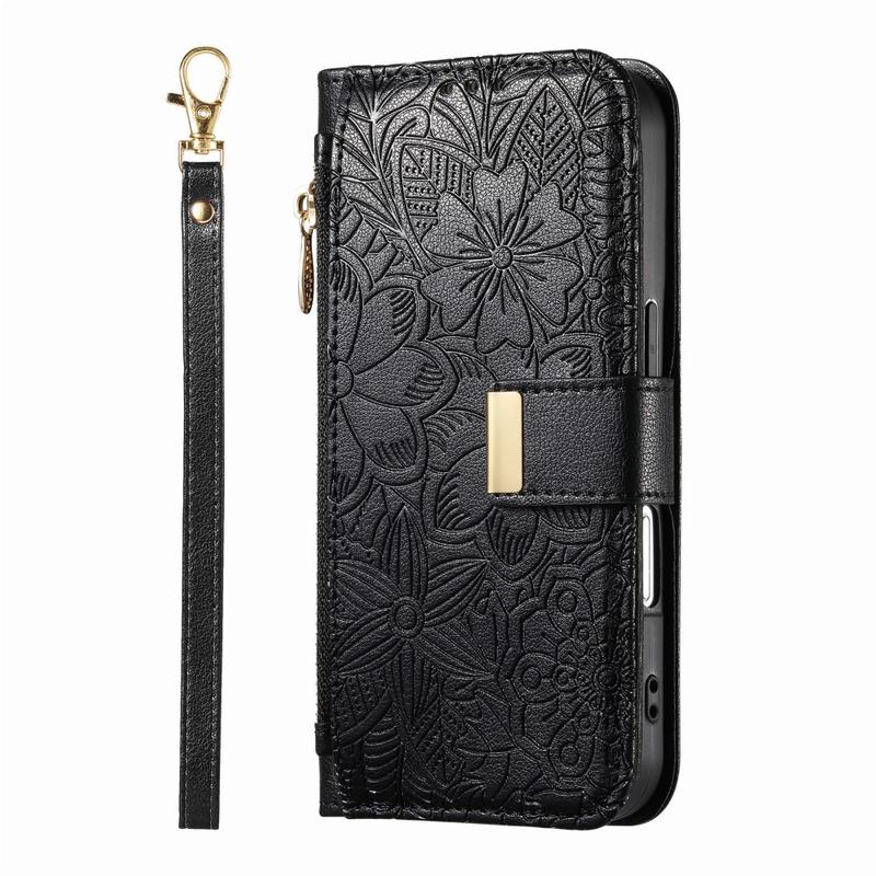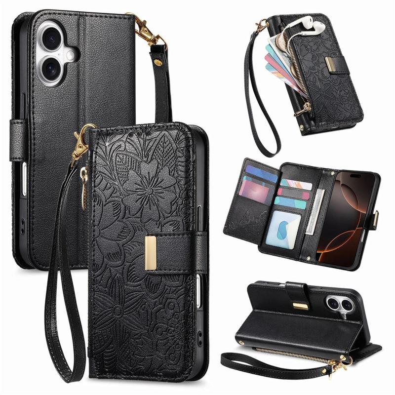 Kukka- ja lehtikuvioinen lompakkokotelo vetoketjullisella taskulla ja rannehihnalla - iPhone 17