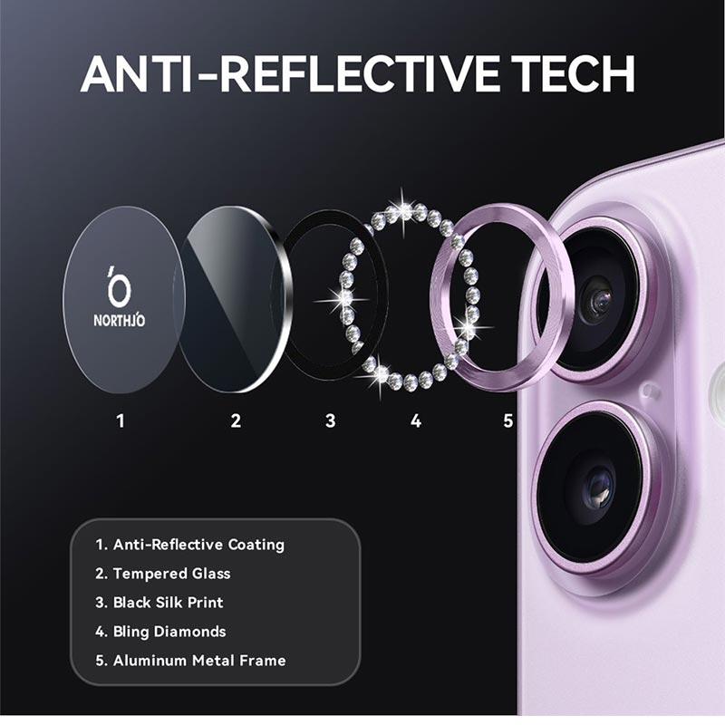 NORTHJO Rhinestone Lens Protector tarjoaa molempien maailmojen parhaat puolet - ensiluokkaista kimallusta ja lujaa kestävyyttä. Se parantaa puhelimesi ulkonäköä säilyttäen samalla ammattimaisen valokuvakirkkauden ja jokapäiväisen suojan.