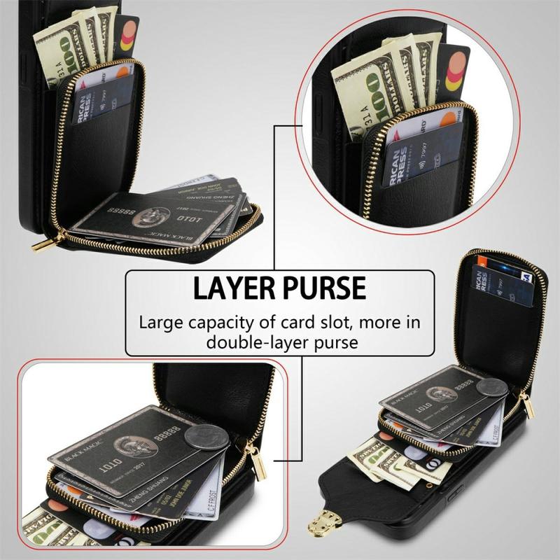 - Turvallinen vetoketjullinen lompakko - laitteistosolki ja vetoketju pitävät kortit, käteisen ja pienet esineet turvassa.
