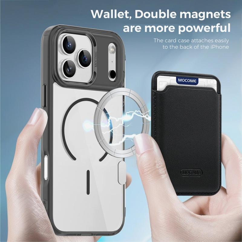 Tämä iPhone 17 Pro Max -kotelo tarjoaa 360°:n suojan ja modernin mukavuuden. Irrotettavan magneettikorttipidikkeen ansiosta se sopii niille, jotka haluavat matkustaa kevyesti, ja MagSafe-yhteensopivuus takaa vaivattoman langattoman latauksen. Sen ohuen, kristallinkirkkaan muotoilun ansiosta voit esitellä iPhone 17 Pro Max -puhelintasi ja pitää sen samalla suojattuna.