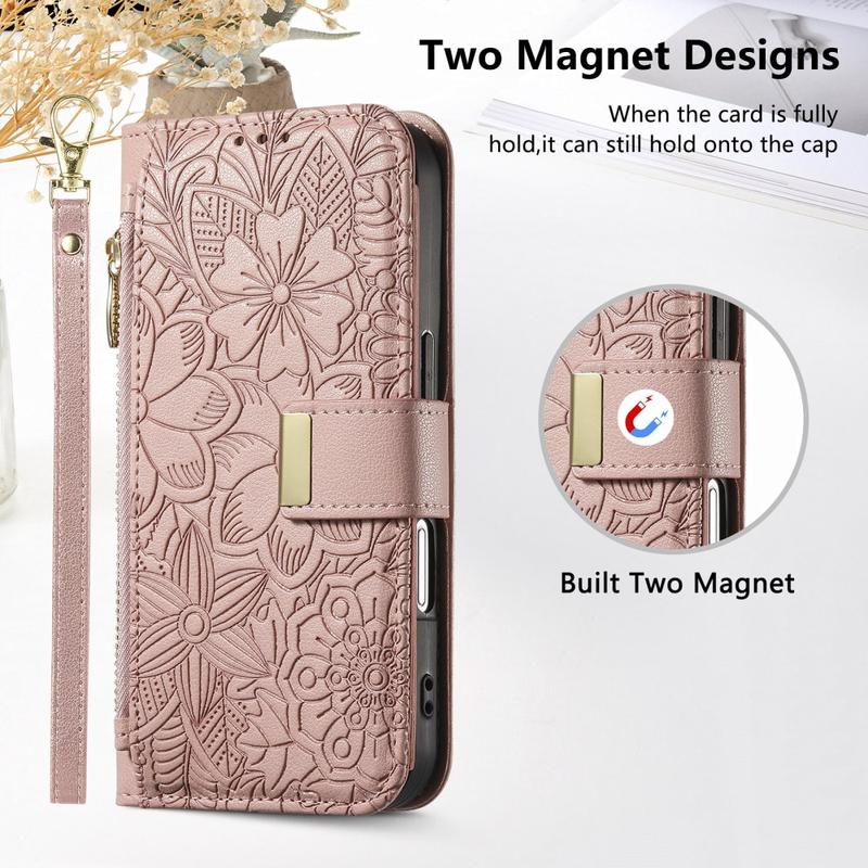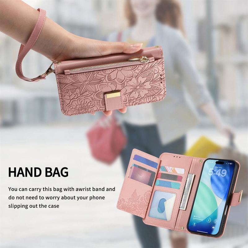 Kukka- ja lehtikuvioinen lompakkokotelo vetoketjullisella taskulla ja rannehihnalla - iPhone 17 Pro Max