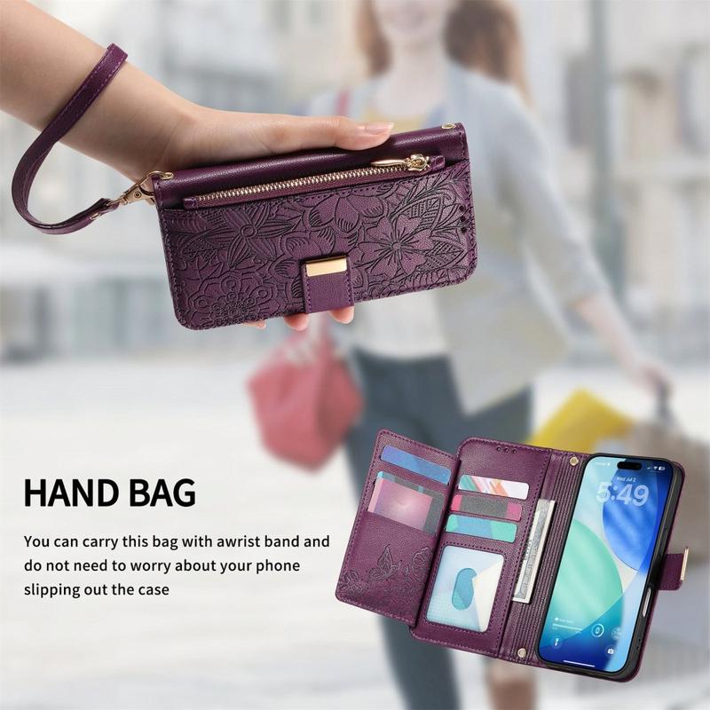 Kukka- ja lehtikuvioinen lompakkokotelo vetoketjullisella taskulla ja rannehihnalla - iPhone 17 Pro Max