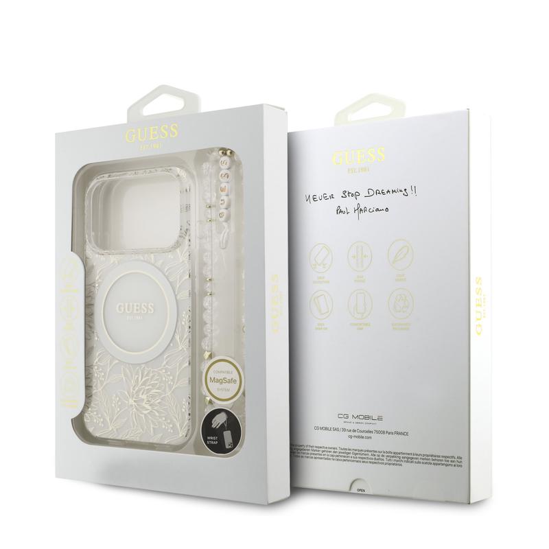Guess IML Flowers Allover Electro Kotelo Pearl Hihna - iPhone 17 Pro - MagSafe yhteensopiva