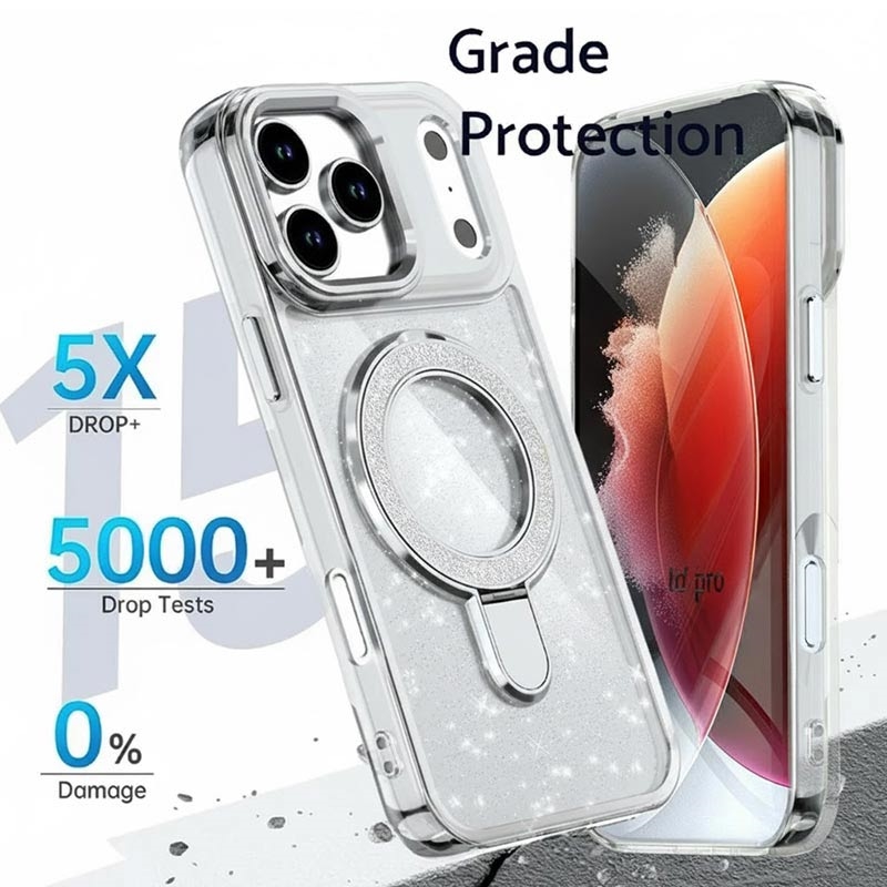 Tuo tyyli ja suojaus yhteen iPhone 17 Pro Maxin glitterkotelossa, jossa yhdistyvät tyylikäs kimallus ja luotettava arkipäivän kestävyys. Laadukkaista materiaaleista valmistettu ja sisäänrakennetulla metallirengasjalustalla varustettu kotelo pitää puhelimesi turvallisena, toimivana ja muodikkaana koko päivän.