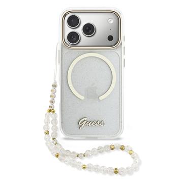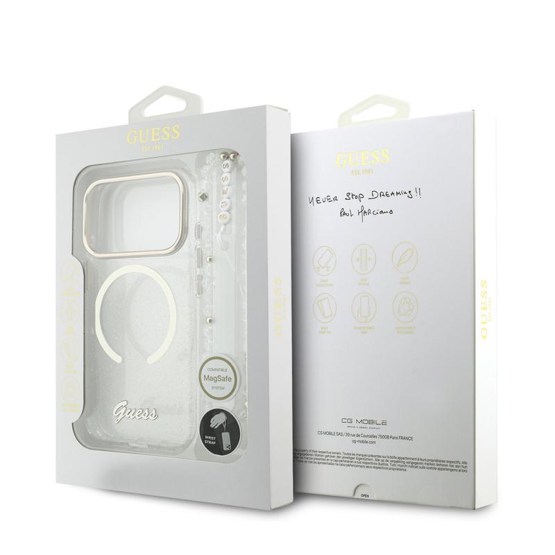Guess IML Glitter Script MagSafe Hihnakotelo iPhone 17 Pro Max -puhelimelle - kimalteleva takakansi rannehihnalla, PC+TPU-suojaus, MagSafe-yhteensopiva