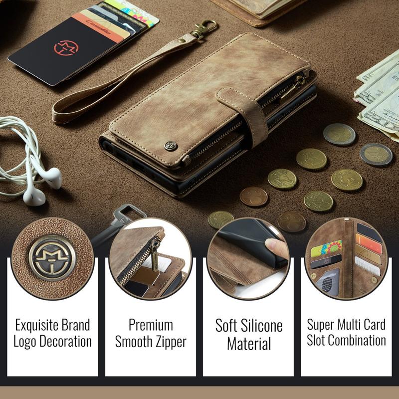 Caseme C30 on monitoiminen lompakkokotelo iPhone 17 Pro:lle, joka tarjoaa tehokkaan kattavan suojan ja ainutlaatuisen, hienostuneen muotoilun. Tämä tyylikäs kotelo on valmistettu korkealaatuisesta polyuretaanista, ja se on vahvistettu iskunkestävällä TPU-sisäkuorella, joka istuu iPhone 17 Pro:lle suorastaan täydellisesti. Lisäksi Caseme C30 -lompakkokotelossa on lukuisia korttipaikkoja, yksi suuri rahalokero sisällä ja yksi vetoketjullinen ulkotasku, jotka kaikki on suojattu turvallisella magneettisuljuksella.