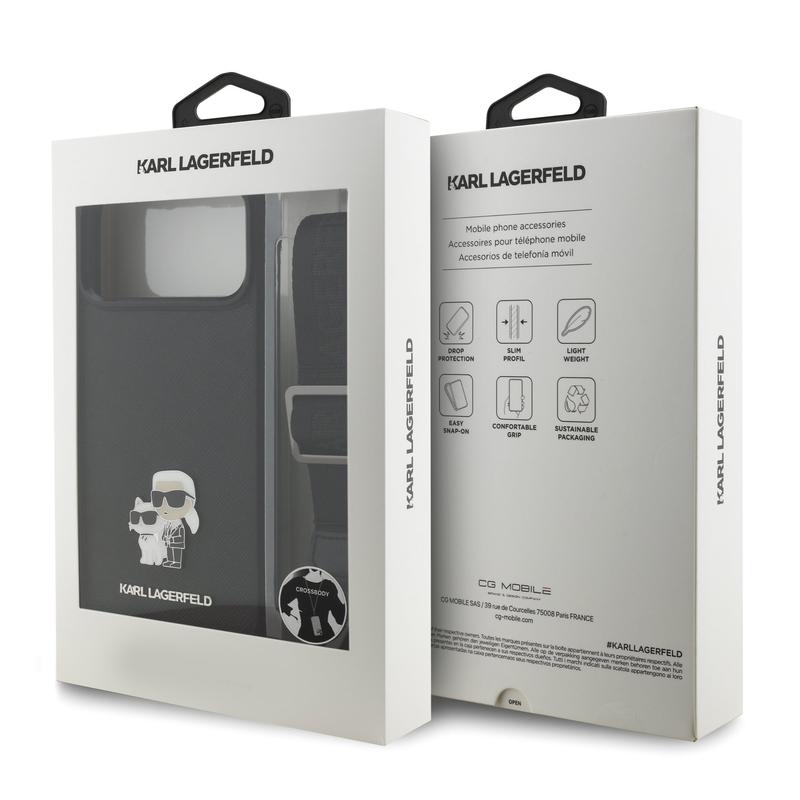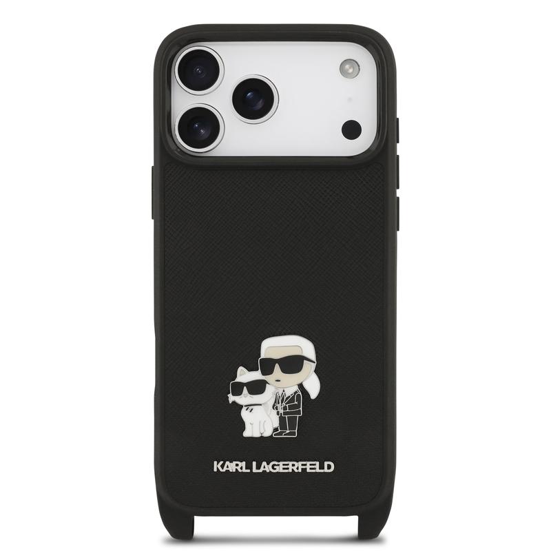 iPhone 17 Pro Karl Lagerfeld Saffiano Crossbody Metal Karl & Choupette Cover - Musta tarjoaa tuotteen, joka on yhtä toimiva kuin tyylikäs. Suojaa iPhone 17 Pro -puhelintasi tällä elegantilla suojakuorella ja nauti sekä turvallisuuden että muodin eduista.