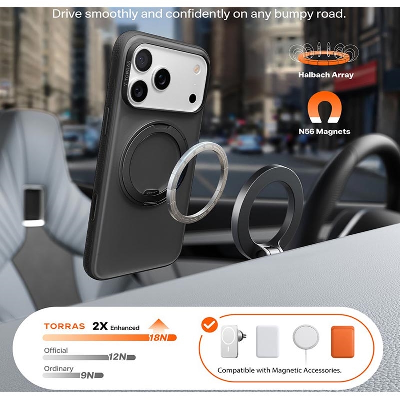 TORRAS O-Fitness Series iPhone 17 Pro Max -kotelo tarjoaa täydellisen yhdistelmän suojaa, toimivuutta ja tyyliä. Sen 360° kääntyvä potkulaudan jalusta tarjoaa vertaansa vailla olevaa mukavuutta mediankäyttöön ja handsfree-käyttöön, kun taas parannettu MagSafe-yhteensopivuus takaa turvallisen ja tehokkaan latauksen. Sotilasluokan suojaus ja ergonominen muotoilu tekevät siitä ihanteellisen valinnan käyttäjille, jotka etsivät puhelinkotelosta sekä kestävyyttä että mukavuutta.