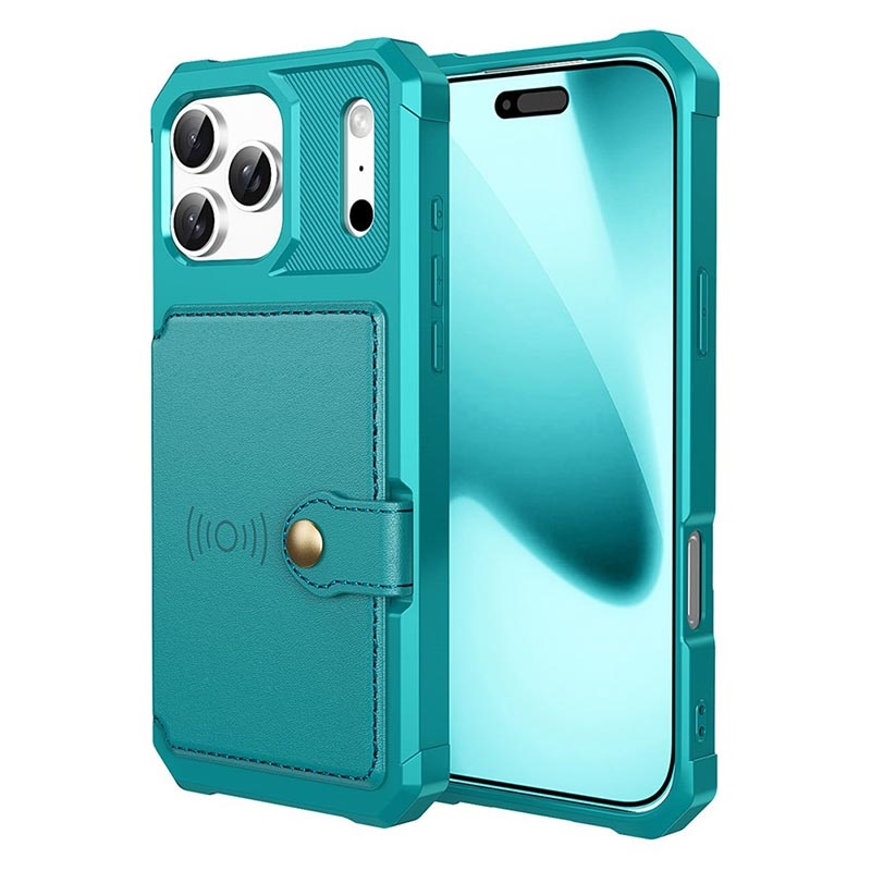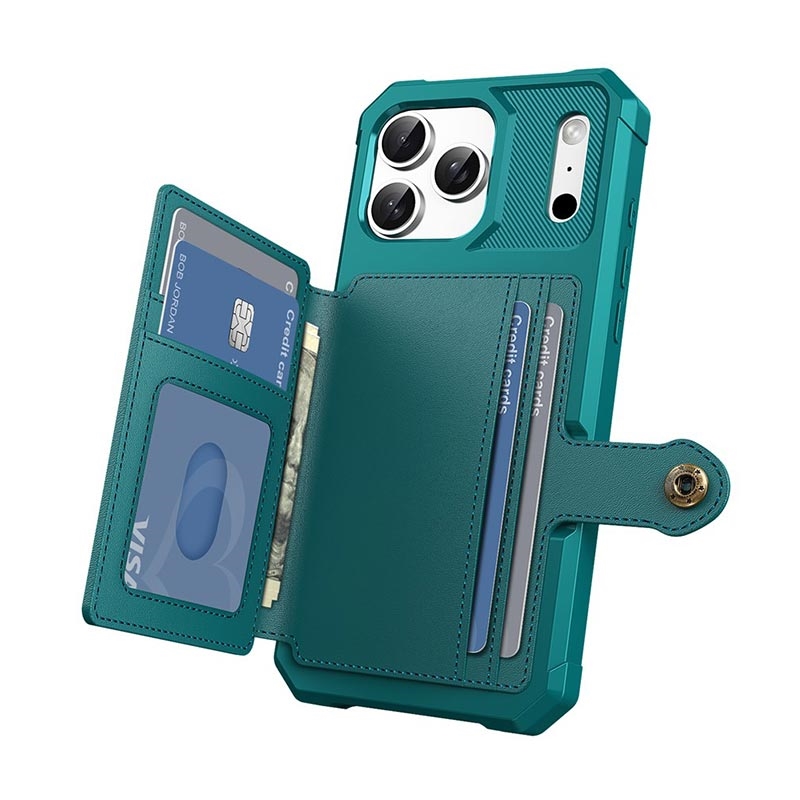- iPhone 17 Pro Max -lompakkokotelossa on turvallinen painonappikiinnitys, lompakon muotoilu ja useita korttipaikkoja käteistaskulla