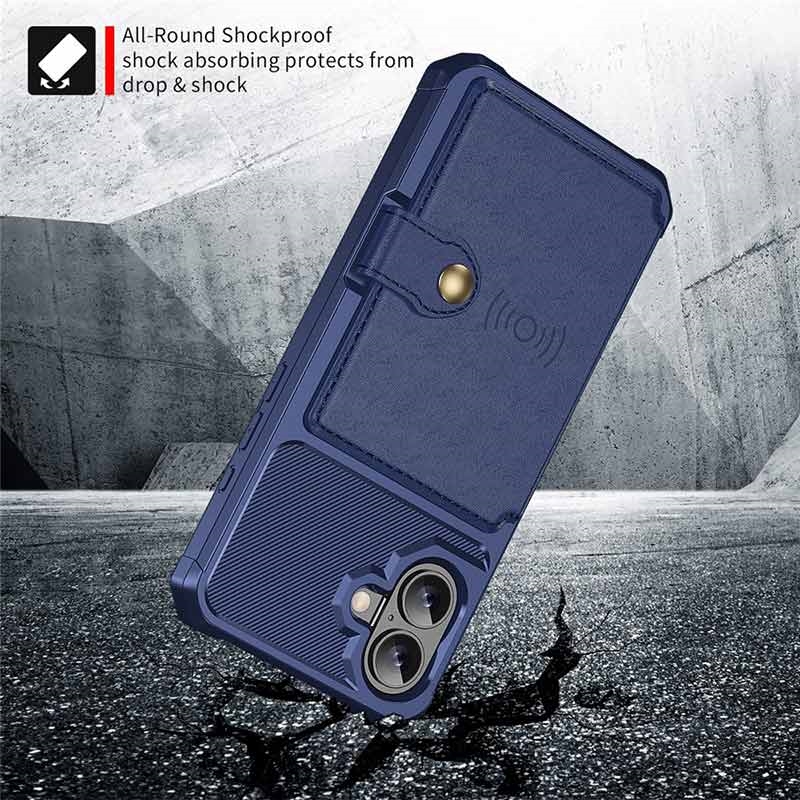 - iPhone 17 -lompakkokotelossa on turvallinen painonappikiinnitys, lompakon muotoilu ja useita korttipaikkoja käteistaskulla