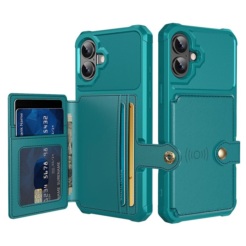 - iPhone 17 -lompakkokotelossa on turvallinen painonappikiinnitys, lompakon muotoilu ja useita korttipaikkoja käteistaskulla