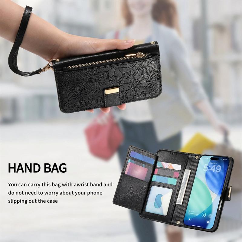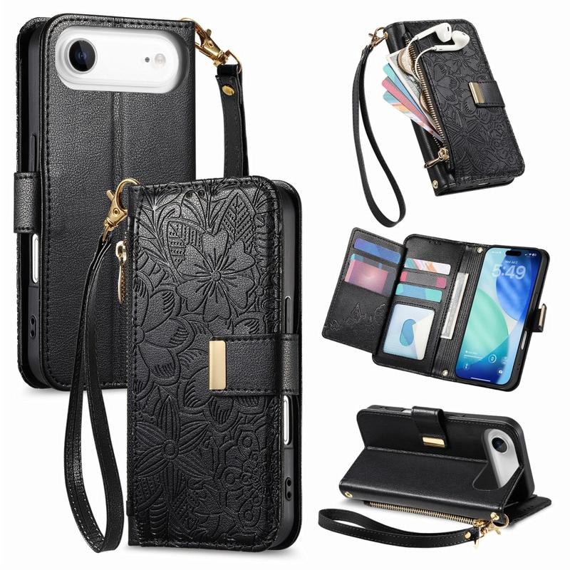 Kukka- ja lehtikuvioinen lompakkokotelo vetoketjullisella taskulla ja rannehihnalla - iPhone Air