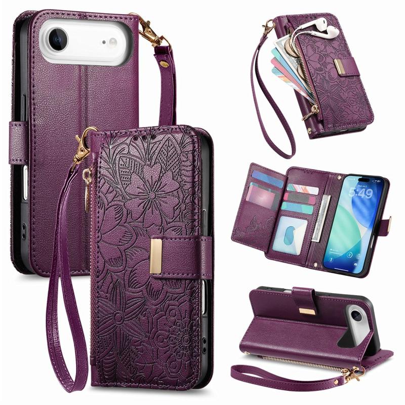 Kukka- ja lehtikuvioinen lompakkokotelo vetoketjullisella taskulla ja rannehihnalla - iPhone Air