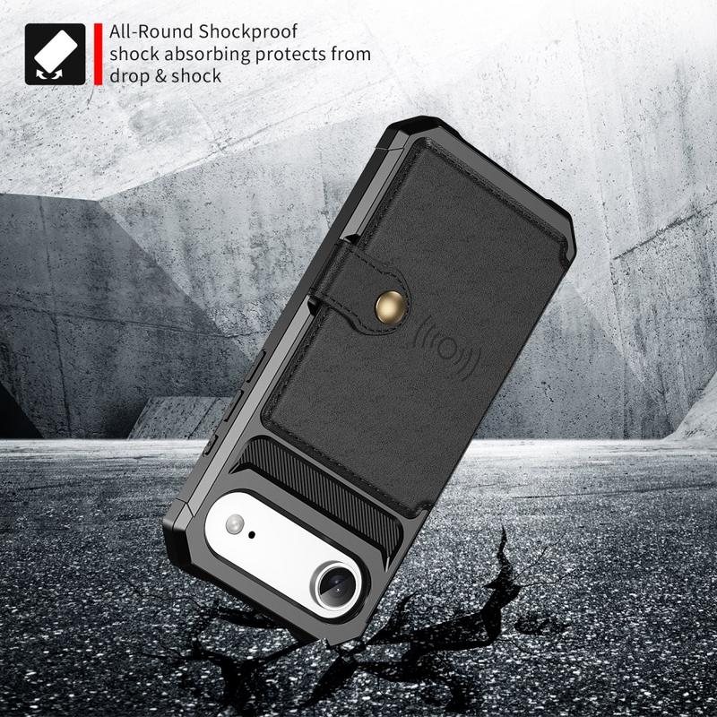 - iPhone Air -lompakkokotelossa on turvallinen painonappikiinnitys, lompakon muotoilu ja useita korttipaikkoja käteistaskulla