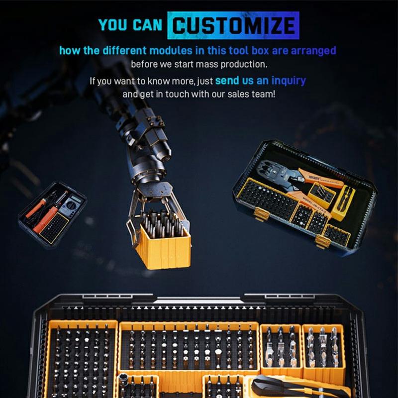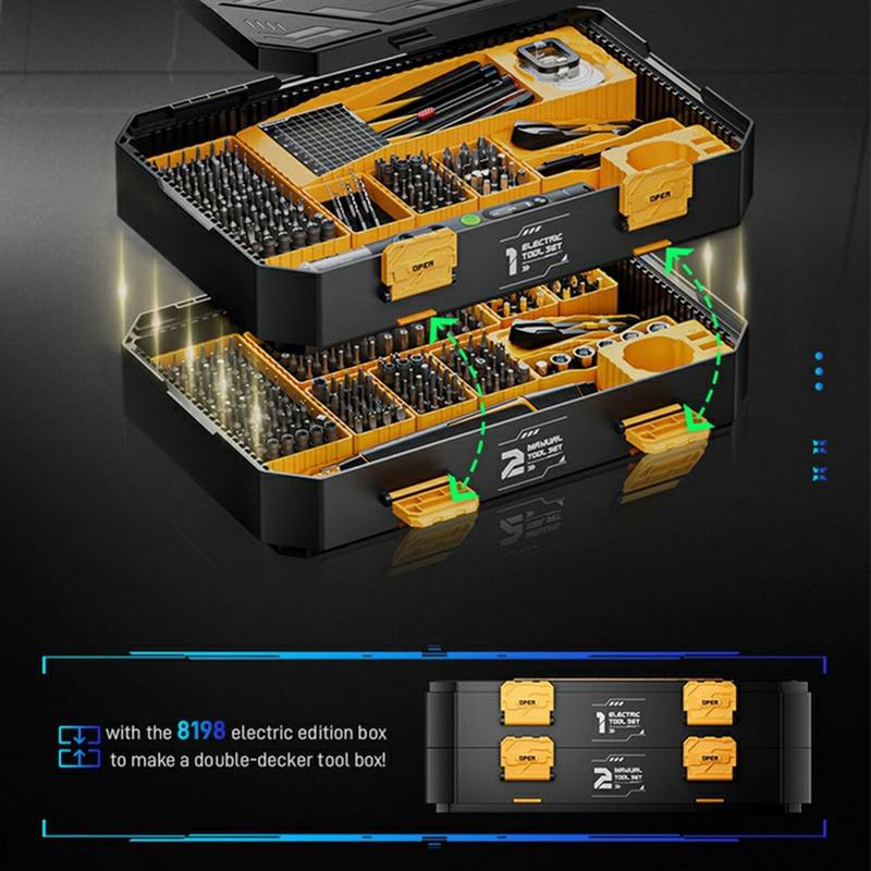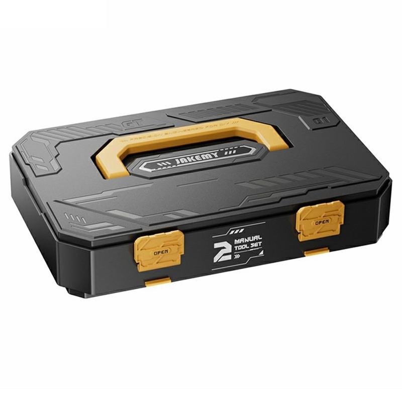 JAKEMY JM-8199 JM-8199 257-in-1 kodin korjaustyökalusarja on täydellinen ratkaisu kotitalouden huoltoon, DIY-projekteihin ja ammattimaiseen korjaamiseen. Modulaarisen rakenteensa ansiosta se mahdollistaa mukautettavat yhdistelmät eri korjaustilanteisiin, mikä tekee siitä erittäin monipuolisen. Mukana toimitettu 2-in-1-käsiruuvinväännin tukee H4.0- ja H6.3-piikkejä ilman sovittimia, ja siinä on kaksitoiminen liitin nopeaa sokkonaulausta varten. Sen ergonominen kahva lisää vääntömomenttia 20 % ja tuottaa jopa 5 NM tehokasta suorituskykyä. Kätevän bittisäilytyksen ja kannettavan rakenteen ansiosta tämä työkalupakki takaa, että olet valmis kaikkiin korjaustehtäviin kotona tai matkalla.