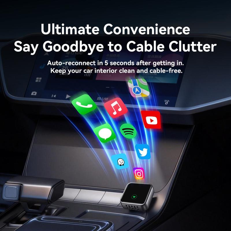 JOYROOM JR-CP3 -sovittimen avulla langallinen infotainment-järjestelmäsi tuntuu aidosti langattomalta. Tämä kompakti USB-A-dongle tukee sekä langatonta Apple CarPlayta että langatonta Android Autoa, joten voit liittää puhelimesi ilman kaapelia joka kerta, kun ajat. Kun sovitin on asetettu, se voi muodostaa automaattisen yhteyden noin 5 sekunnissa auton käynnistämisen jälkeen, jolloin pääset navigoimaan, kuuntelemaan musiikkia ja soittamaan puheluita nopeammin ja vaivattomammin.