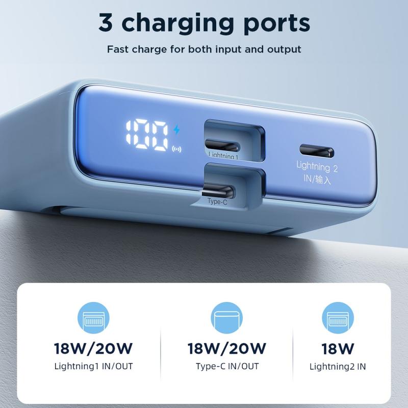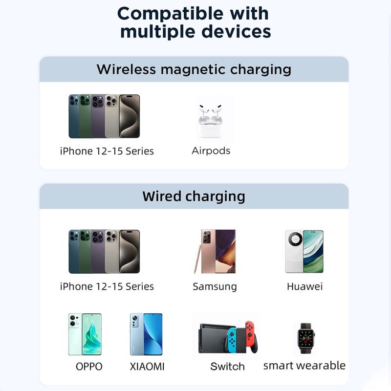 Mukana irrotettava kaapeli, voi ladata kolme laitetta yhdellä kaapelilla, myös Apple/Android-laitteille/itselataukselle.