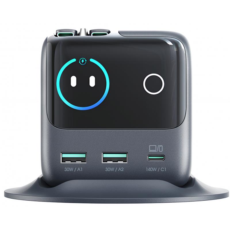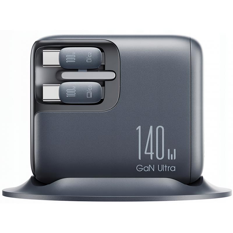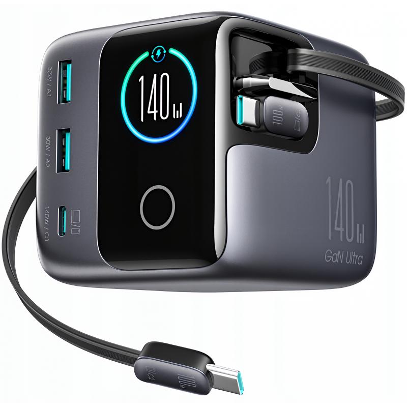 Joyroom JR-TRD01 Podix 140W:n pöytämallinen GaN-laturi, jossa on sisäänvedettävät USB-C-johdot ja LCD-näyttö