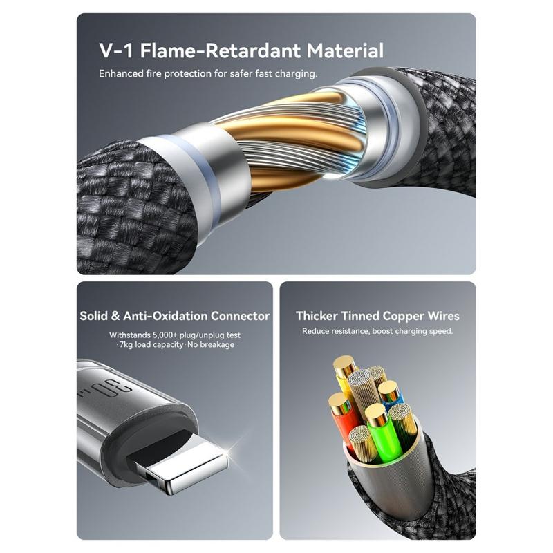 - Kahden liittimen muotoilu: USB-C - USB-C + Lightning laajemman laiteyhteensopivuuden takaamiseksi.