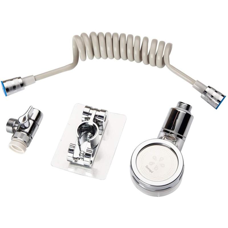 Sarja sisältää käsisuihkusuuttimen, kiertoventtiilin, letkun ja kiinnikkeen. Kiinnitä vain vaihtoventtiili hanaan ja liitä letku - ei tarvita työkaluja tai putkityökokemusta.