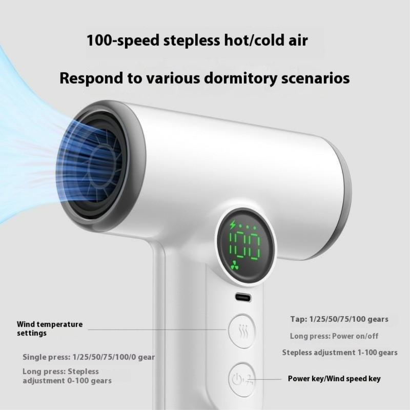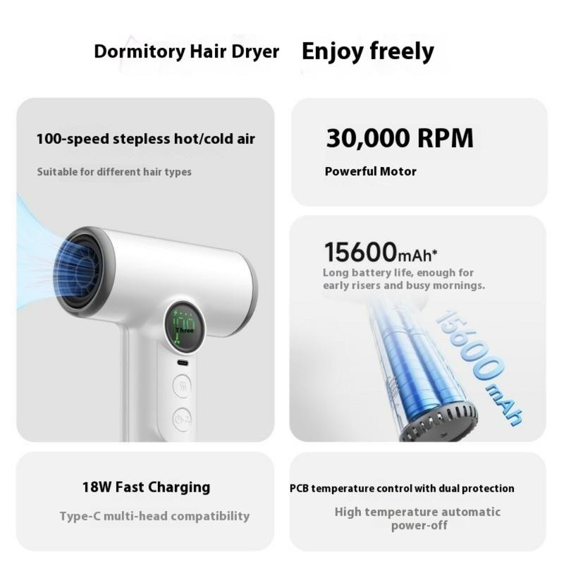 Langaton hiustenkuivaaja / puhalluskuivain 100-nopeudella Cool/Warm, älykäs näyttö - 15600mAh, 30000 RPM-moottori