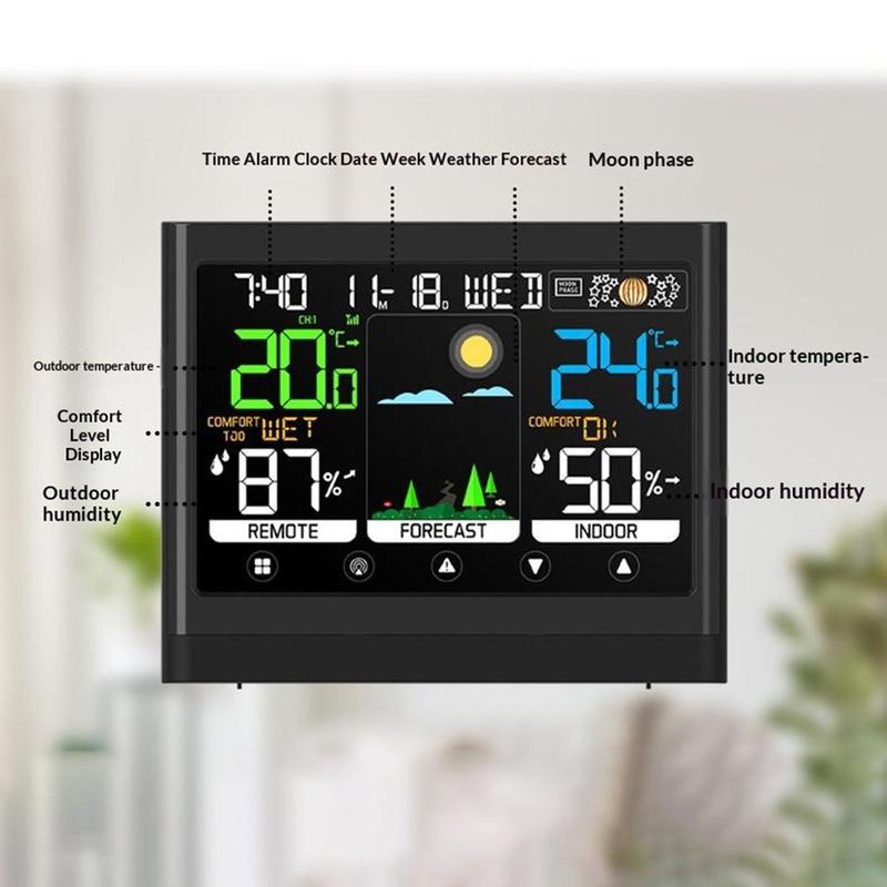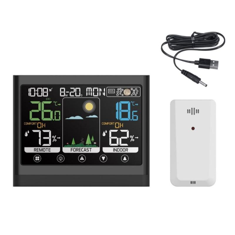 Tämä värillinen kosketusnäytöllinen sääasema yhdistää kellon, sääennusteen, lämpötilan seurannan, kosteuden mittauksen ja hälytystoiminnot yhteen käytännölliseen pöytämalliin. Se on suunniteltu päivittäiseen käyttöön kotona tai toimistossa, ja sen avulla voit tarkistaa sisä- ja ulkoilman olosuhteet yhdellä silmäyksellä samalla, kun tärkeät päivittäiset tiedot pysyvät selvästi näkyvillä. Suuri värinäyttö ja kosketusohjaus tekevät siitä hyödyllisen lisälaitteen yöpöydälle, työpöydälle, keittiöön tai olohuoneeseen.