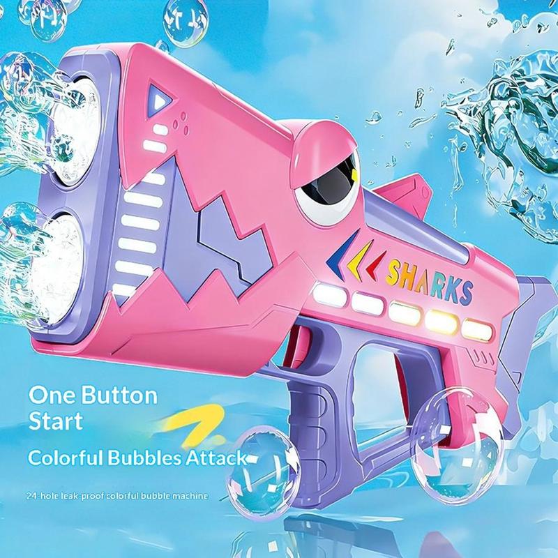 Lasten hai-sähkökuplapistooli - 24-reikäinen automaattinen kuplakone LED-valoilla, USB-ladattava kuplapyssy