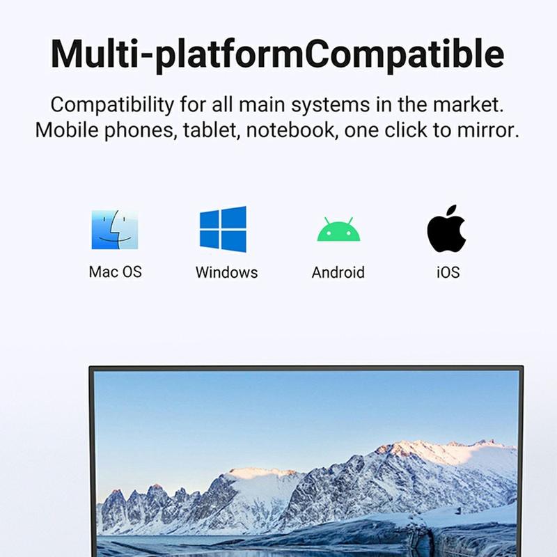 P1000 on yhteensopiva Androidin, iOS:n, Windowsin ja macOS:n kanssa, ja se tukee Miracast- ja P2P-tekniikoita. Tämä mahdollistaa saumattoman näytön peilaamisen useisiin laitteisiin, joten se soveltuu sekä henkilökohtaiseen että ammattikäyttöön.